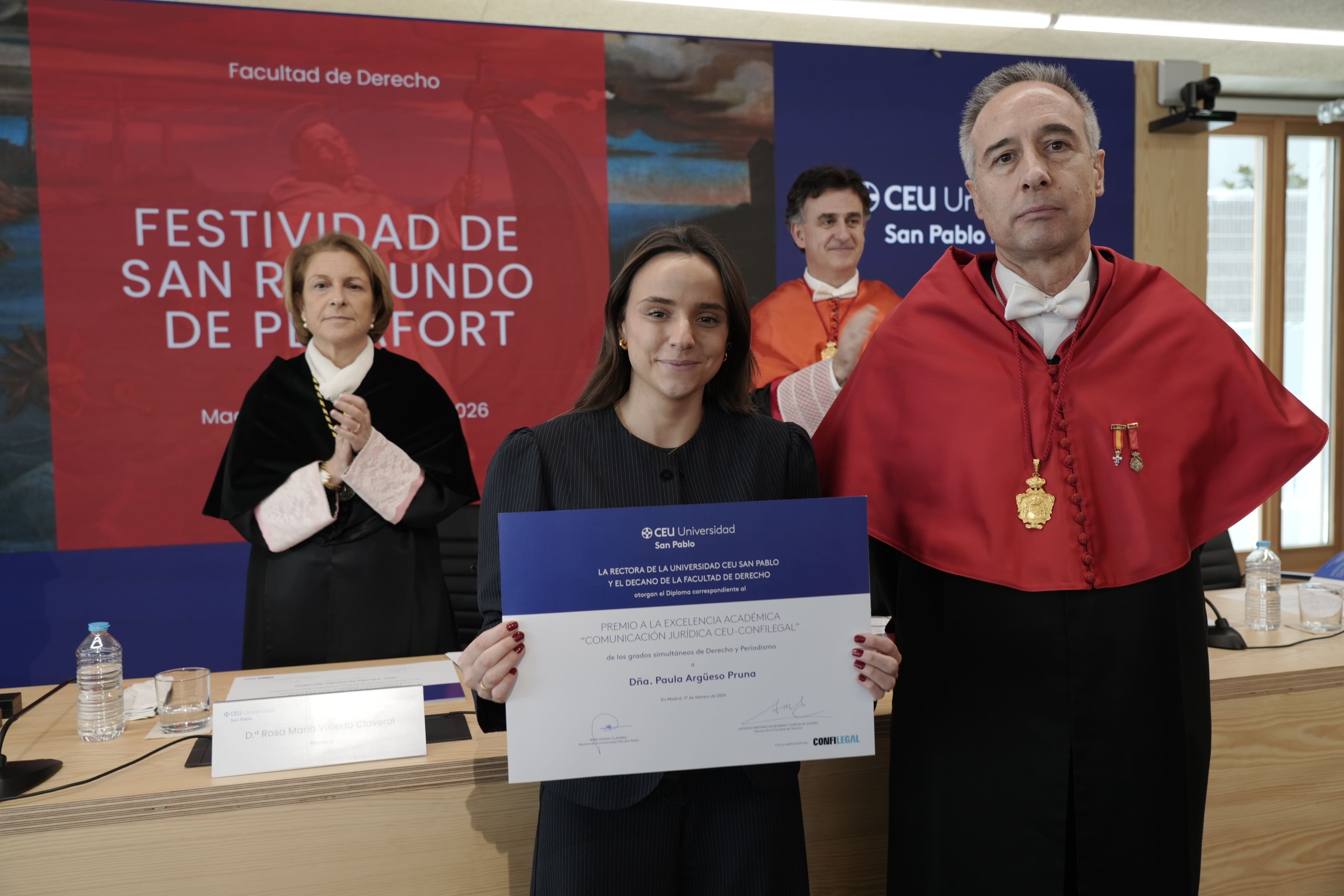 En el transcurso del acto académico de la Festividad de San Raimundo de Peñafor, la Facultad de Derecho de la CEU USP, entregó los Premios a la Excelencia Académica 'Comunicación jurídica CEU-Confilegal' que reconocen a los estudiantes con los mejores expedientes en los dobles grados que combinan Derecho con Comunicación. En esta edición, las galardonadas fueron Claudia Fernández González, estudiante del Grado en Derecho y Publicidad y Relaciones Públicas; y Paula Argüeso Pruna, estudiante del Grado en Derecho y Periodismo.