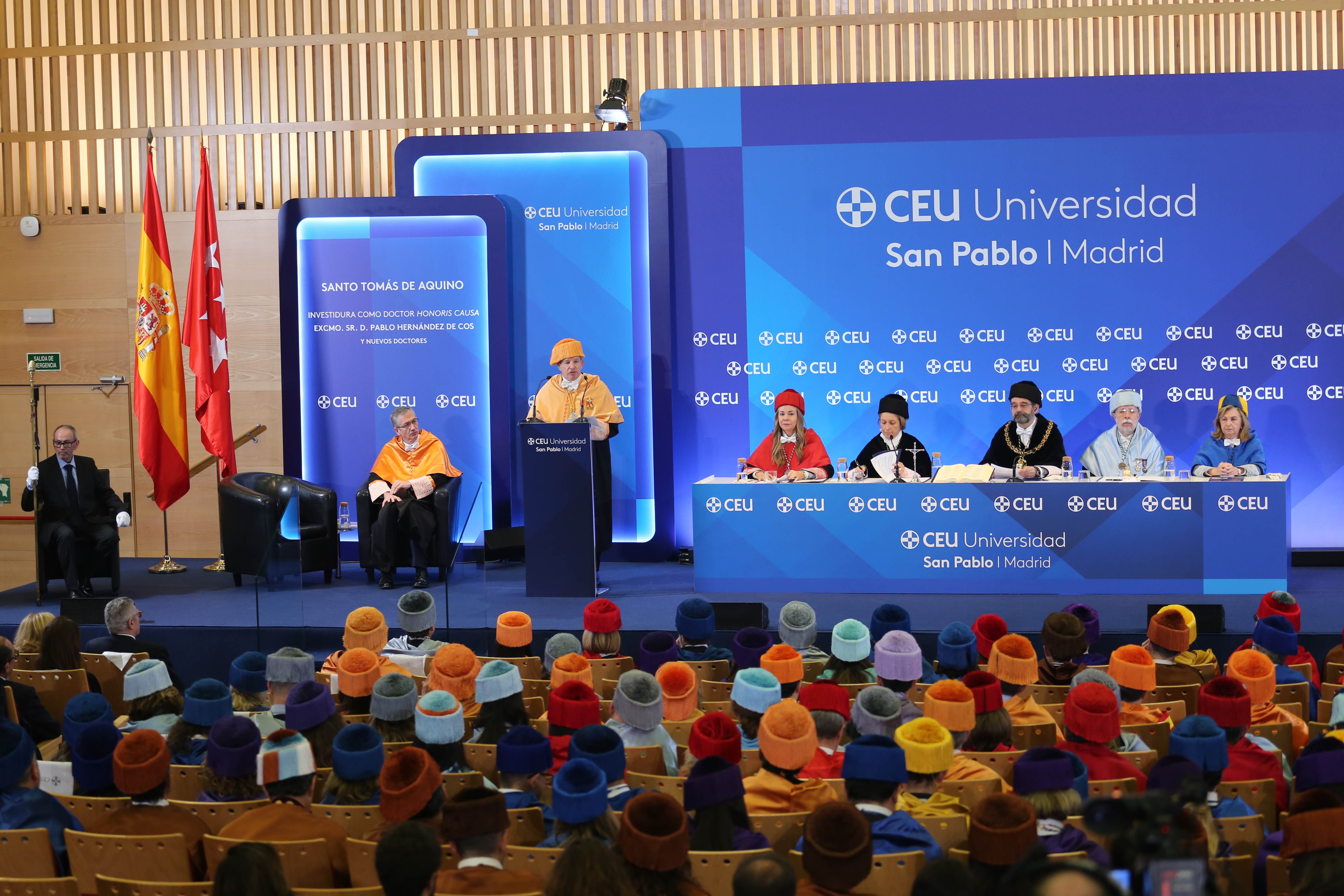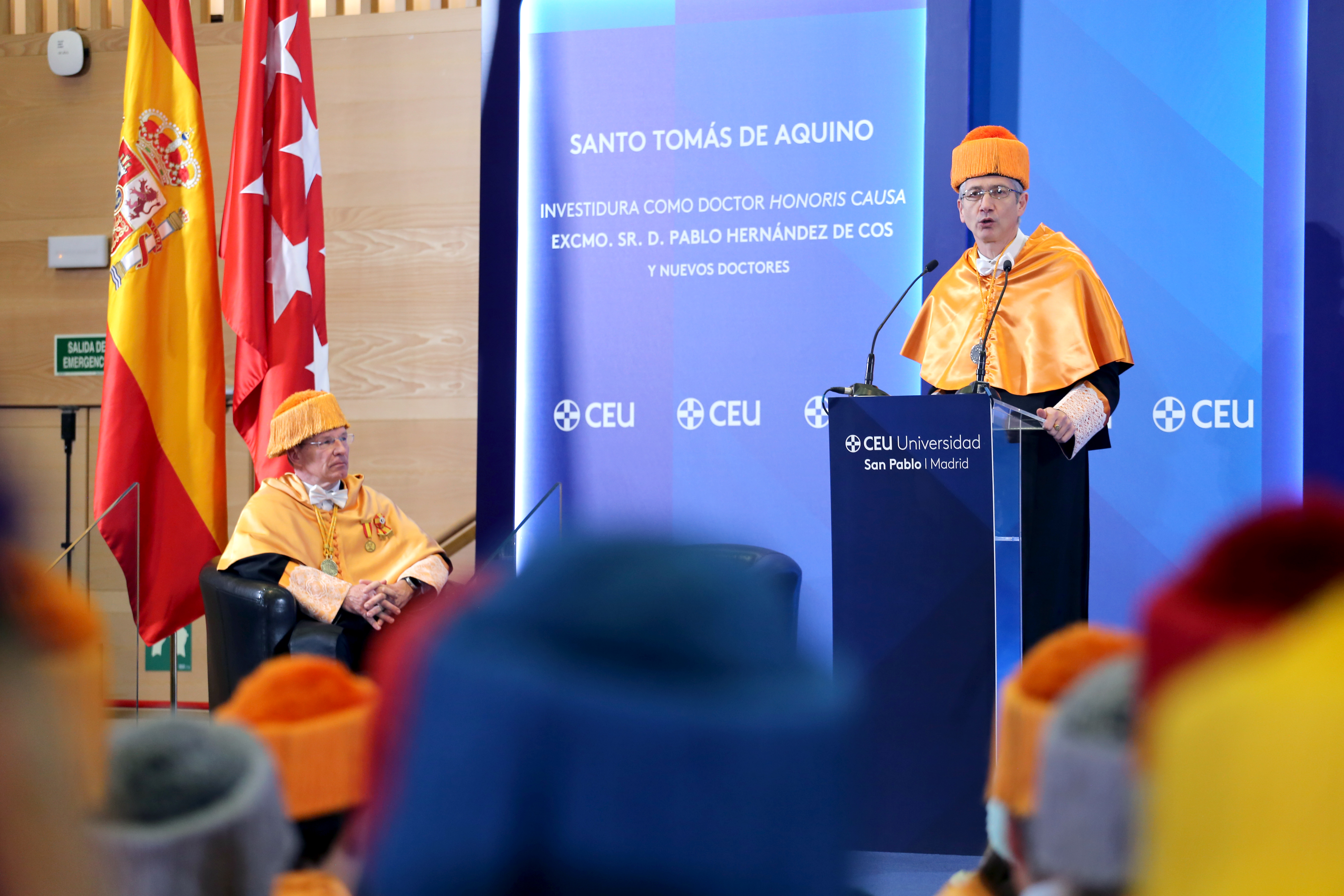 The General Manager of the Bank for International Settlements (BIS), Pablo Hernández de Cos, has been invested Doctor Honoris Causa by CEU USP during the Academic Ceremony held to mark the Feast of Saint Thomas Aquinas, patron saint of universities and students. Hernández de Cos was honored in recognition of his outstanding merits in the field of economics and finance, as well as the notable prestige and international standing he has achieved.