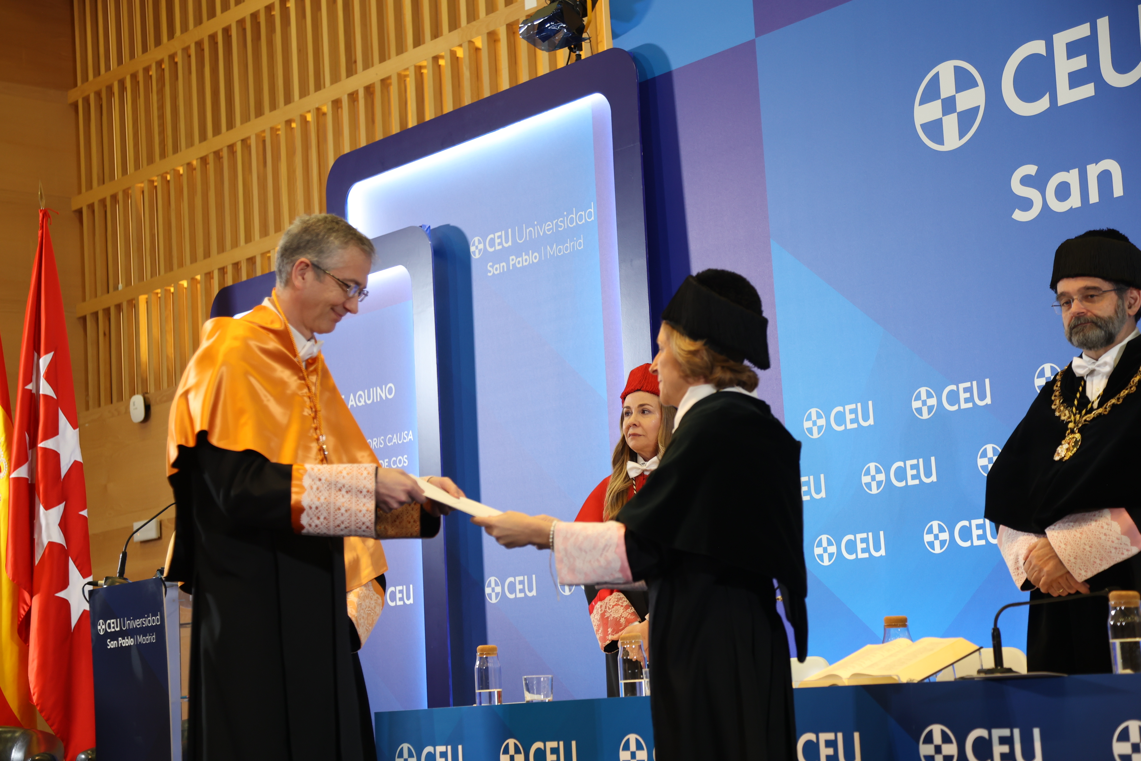 The laudatio was delivered by Ricardo Palomo, Professor of Financial Economics and Dean of the Faculty of Economics and Business Administration. In his address, he stated that the distinction “recognizes an exceptional career in the service of economic institutions, characterized by intellectual rigor, technical independence and a deep sense of public responsibility. These values are fully aligned with the mission of CEU USP: to educate principled individuals, outstanding professionals and committed citizens in the service of society.”